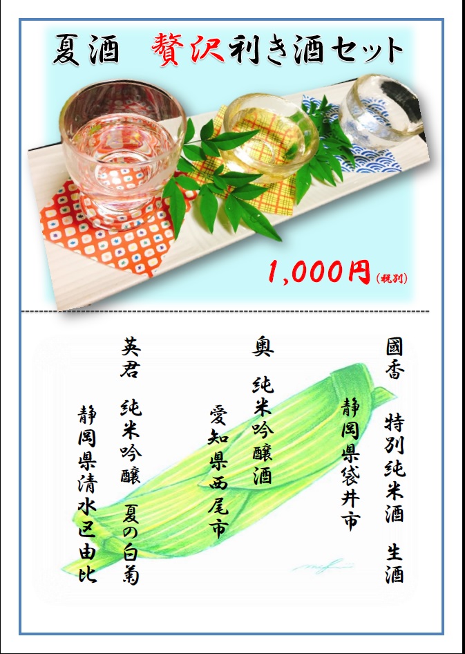 お客様各位 この度 静岡の名酒 国香酒造さんに 特別に 当店限りの 生酒を作って頂き ましたので 夏限定で提供させて頂きます。 是非お問い合わせ下さい。 お料理と共に お楽しみ頂けたら幸いです。 尚 お問い合わせは 0538-44-0414 (担当 大石まで)